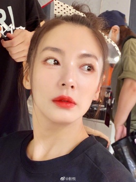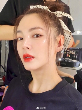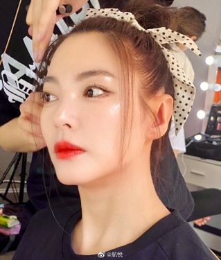 >组图:张雨绮头绑蝴蝶结化轻透妆容 唇红齿白对镜甜笑似少女