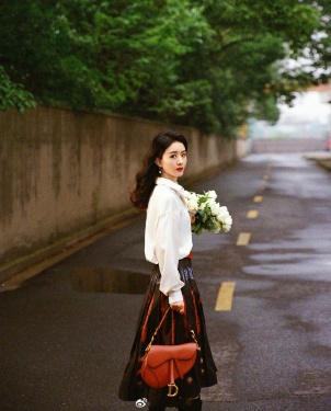 组图:赵丽颖穿百褶裙拿捧花拍大片 回眸一瞬显恬静淡雅