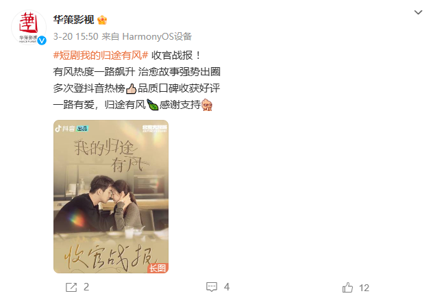 与抖音上其他动辄七八十集的付费短剧相比,华策影视已播出的两部短剧在20集左右,用户无需付费。作为首次试水之作,《寻宋》、《我的归途有风》分别有2200万、1.9亿的播放量,而后者的成绩则与原本的IP流量有关。华策围绕版权价值去切入短剧赛道,或为所有手握大量热门IP的影视公司指了条明路。