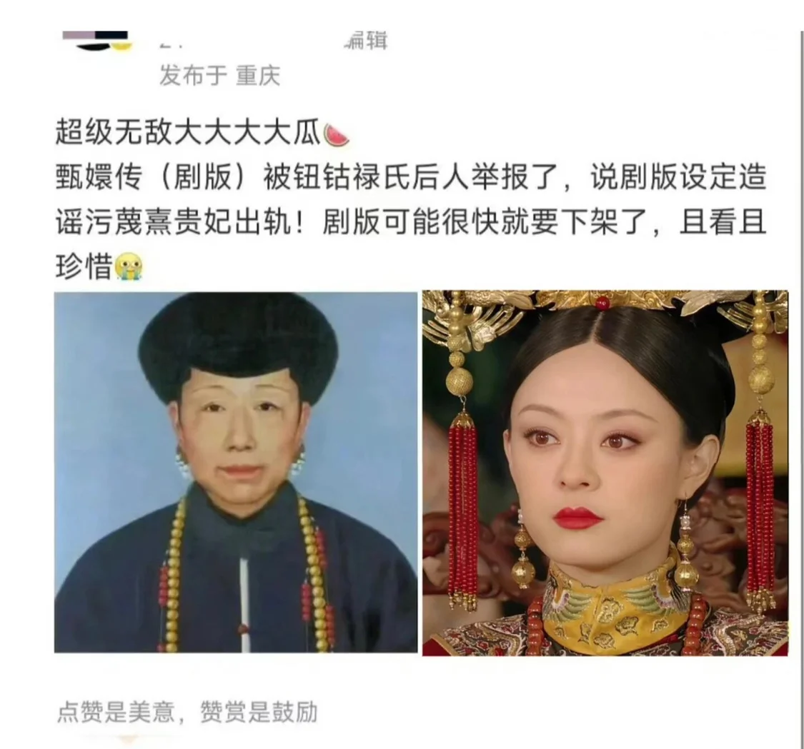 近日,有网友发文称经典影视剧《甄嬛传》被举报将下架,引发关注。网传原因是剧中熹贵妃人设问题,被钮祜禄氏后人举报。