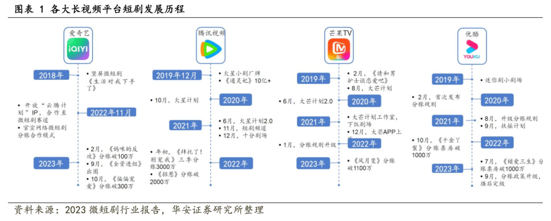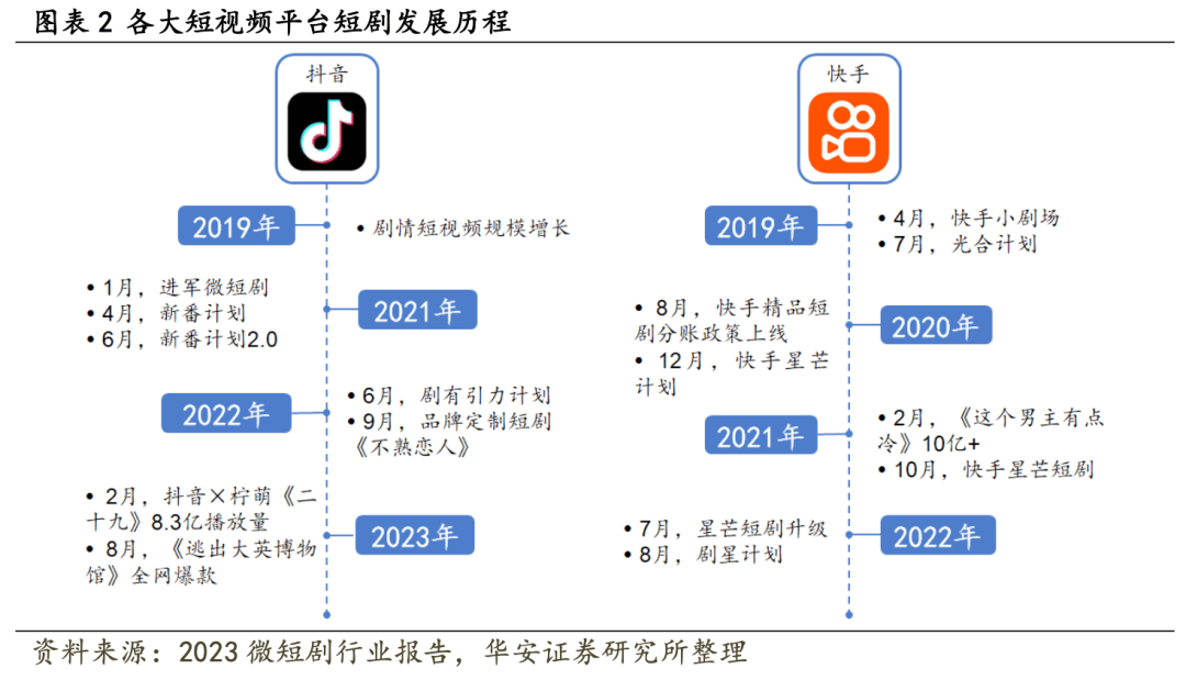 与海外市场相对应,国内短剧行业起步阶段在2018年左右,抖快短视频平台、爱优腾长视频平台完成短剧业务的最初布局、出品尝试,短剧行业开始在国内市场繁荣生长。随后在2020年8月,国家广电总局将单集时长不足10分钟的网络影视剧定义为微短剧,并将其纳入监管,这也为短剧行业打下爆发基础。