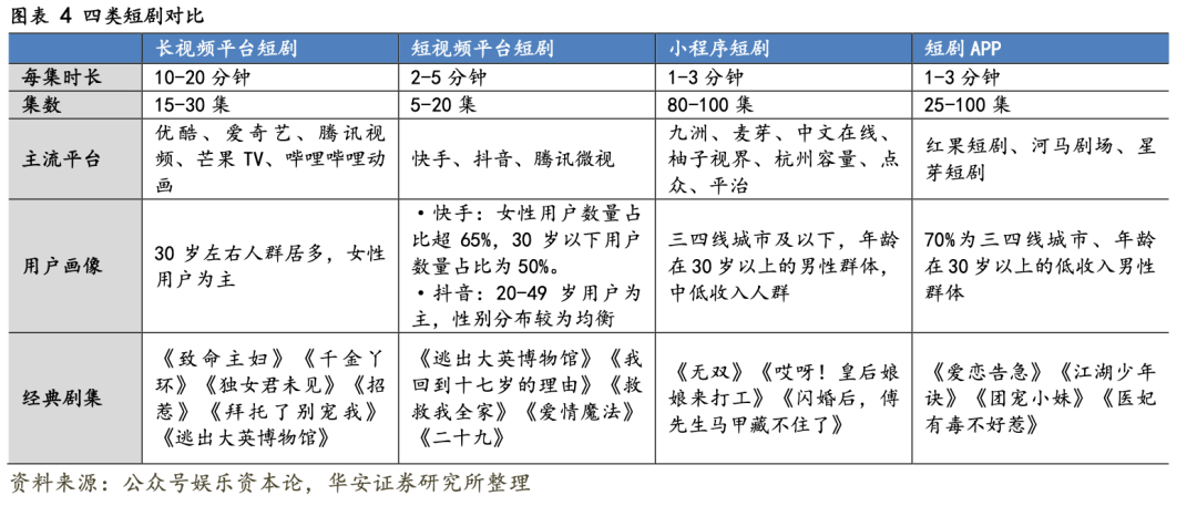 而在供给侧层面,过往的混乱格局也得到明确分型,短剧类型可分为四类:长视频平台短剧、短视频平台短剧、小程序短剧(依托抖音、快手、微信小程序)、短剧 APP (番茄短剧、河马剧场、星芽短剧等)。