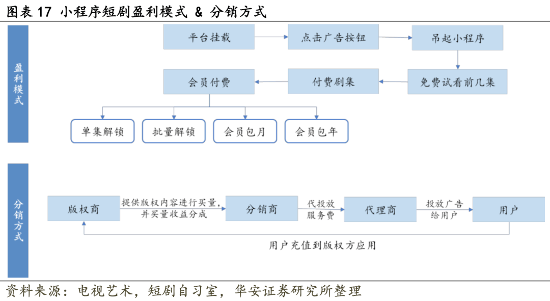 在经历约两个月的投流周期后,短剧上新热度也会逐渐下降。制作方会在短视频平台尝试“分销”,即将内容版权给其他博主内容切片、二创分享,实现用户充值的长尾效应。头部短剧公司在短视频平台的分销合作账号数就超万个,分销方获得的流水分成大概在2%-5%区间。