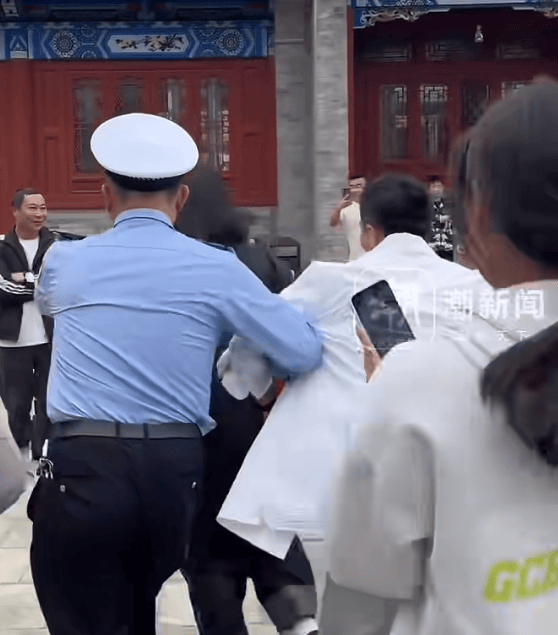 工作人员用胳膊搂着黄轩,