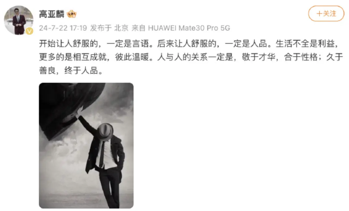 7月22日,高亚麟发文:“开始让人舒服的,一定是言语。后来让人舒服的,一定是人品。生活不全是利益,更多的是相互成就,彼此温暖。人与人的关系一定是,敬于才华,合于性格;久于善良,终于人品。”